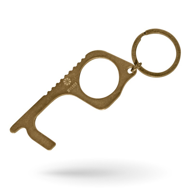 laiton (anti-bactérien) - Dimensions : 80 x 34 x 2,5 mm - Gravure laser (forfait technique en sus : 50 €)